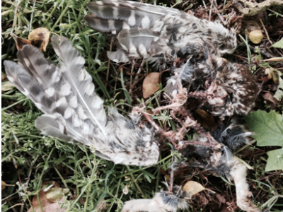 Remains of predated female Little Owl found in nest box.