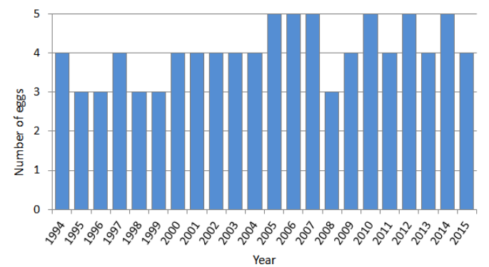 This nest box has been used as a breeding site by Little Owls since 1994, so I thought you might be interested in this graph, which shows the annual clutch size at this site from 1994‒2015. The average clutch size is four eggs.
