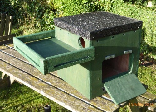 You can modify Bob’s box design for your local area. We’ve increased our box size by 50% to accommodate broods of 4 and 5 chicks – this gives them more room to exercise before branching, and we find that larger boxes are drier inside. Juvenile Little Owls produce lots of mute, especially during wet weather when they eat more worms. Finally, we've side positioned our box check hole and fixed the hinge in a horizontal position to accommodate the front platform.