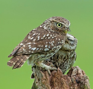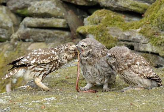 Little Owls are monogamous, which means pairs remain together for at least one breeding season, and usually until one of the pair dies. Established pairs occupy and defend their territory throughout the year. New pairs form in January; these are usually first year or single birds. Courtship behaviours begin in January and are a wonderful spectacle. The pair become very vocal and make frequent contact calls to each other. Pairs are often seen together and the male provides pre-breeding food gifts to the female. These prey items are important as they help the female to acquire fat resources for breeding. Pairs engage in regular copulation and start inspecting nest sites from February onwards.
